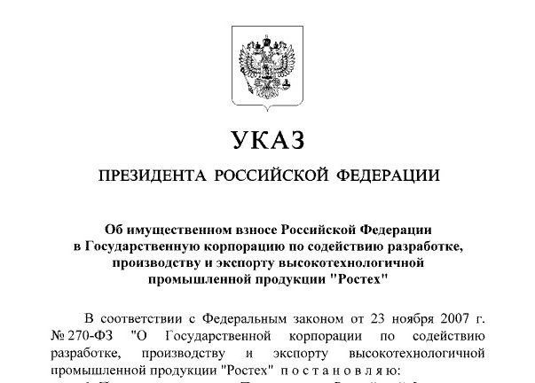 «Принять предложения правительства Российской Федерации: а) о преобразовании федеральных казенных предприятий по перечню согласно приложению… в акционерные общества, 100 процентов акций которых находится в федеральной собственности и передается в качестве имущественного взноса Российской Федерации государственной корпорации по содействию разработке, производству и экспорту высокотехнологичной промышленной продукции “Ростех”», – говорится в документе.
