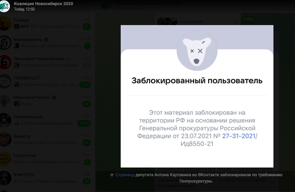 Страница депутата горсовета Новосибирска от либеральной коалиции «Новосибирск 2020» Антона Картавина в соцсети «ВКонтакте» решением Генпрокуратуры (от 23.07.2021 года, №27-31-221. Ид 8550-21) заблокирована на территории Российской Федерации. Сообщение об этом появляется при попытке зайти на страницу депутата. Однако посредством сервиса VPN просмотреть страницу Картавина возможно. Такие действия прокуратуры депутат связывает со своей протестной активностью.