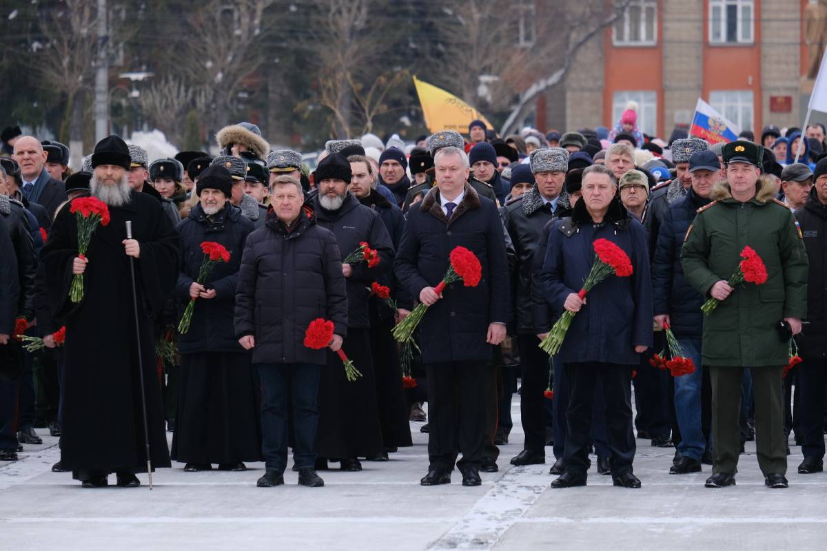 В День защитника Отечества губернатор, секретарь Новосибирского регионального отделения партии «Единая Россия» Андрей Травников , председатель Законодательного собрания области Андрей Шимкив , сенаторы РФ Александр Карелин и Владимир Городецкий приняли участие в церемонии возложения венков и цветов на Мемориальном комплексе «Монумент Славы».