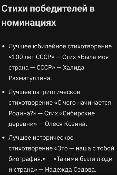Стихи победителей в номинациях вы можете посмотреть в газете, пройдя по ссылке - https://presidentmedia.ru/blog/2023/01/28/stihi-chlenov-zhyuri-i-pobeditelej-v-nominacziyah-konkursa-100-let-sssr/
