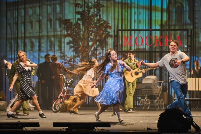 Воплощая истории из своевременной жизни, внушительная квадратура большой сцены ловко превращается в блестящее пространство модной вечеринки, ностальгически преображенный «далекий огромный город, лучше которого и нет на свете», алеющий кумачом чиновничий кабинет или уютную «нору» обывателя. Волшебными усилиями бутафоров здесь зацветают деревья, бегут поезда, разбиваются парки, и холеные фикусы соревнуются в суровой витальности с собаками всех мастей. Богатые и знаменитые швыряются словами, сорят деньгами, пьют дорогое игристое и созерцают искусство. Товарищи попроще зуб дают на холодец и прикладываются к сорокоградусной, а граждане без претензий, но с характером братаются самоплясом в пузатых лубочных бутылях. Все много говорят, временами поют и получают на свою голову то реприманд, то камуфлет, то просто приятную неожиданность.