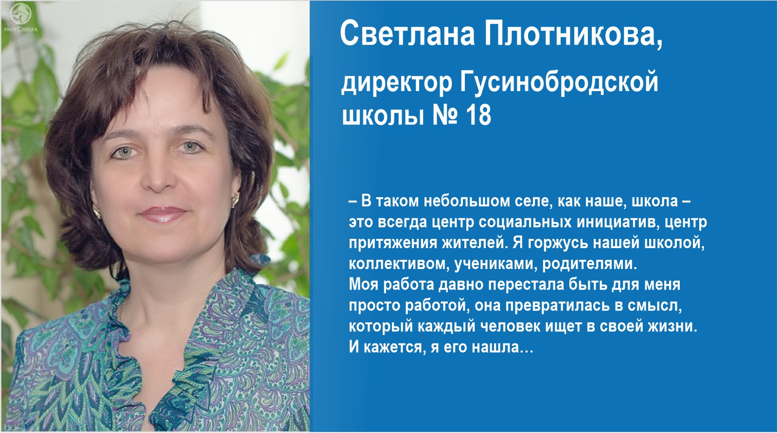 – В таком небольшом селе, как наше, школа – это всегда центр социальных инициатив, центр притяжения жителей. Вот и строим мы свое развитие, основываясь на этом понимании, вовлекая в этот процесс всех селян, – отмечает Светлана Плотникова. – И останавливаться на достигнутом не собираемся, постоянно ставим новые цели и задачи. Я горжусь нашей школой, коллективом, учениками, родителями. Моя работа давно перестала быть для меня просто работой, она превратилась в смысл, который каждый человек ищет в своей жизни. И кажется, я его нашла…