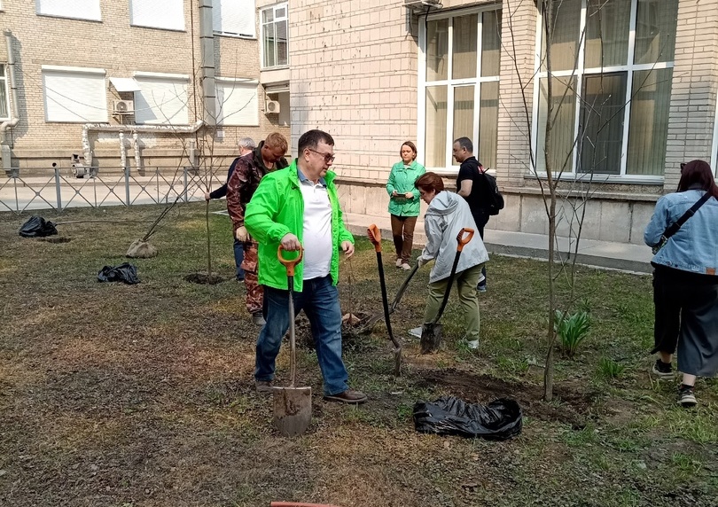 Акция по посадке деревьев состоялась в воскресенье, 7 мая, в НГУ на участке между Лабораторным и Главным корпусами университета (ул.