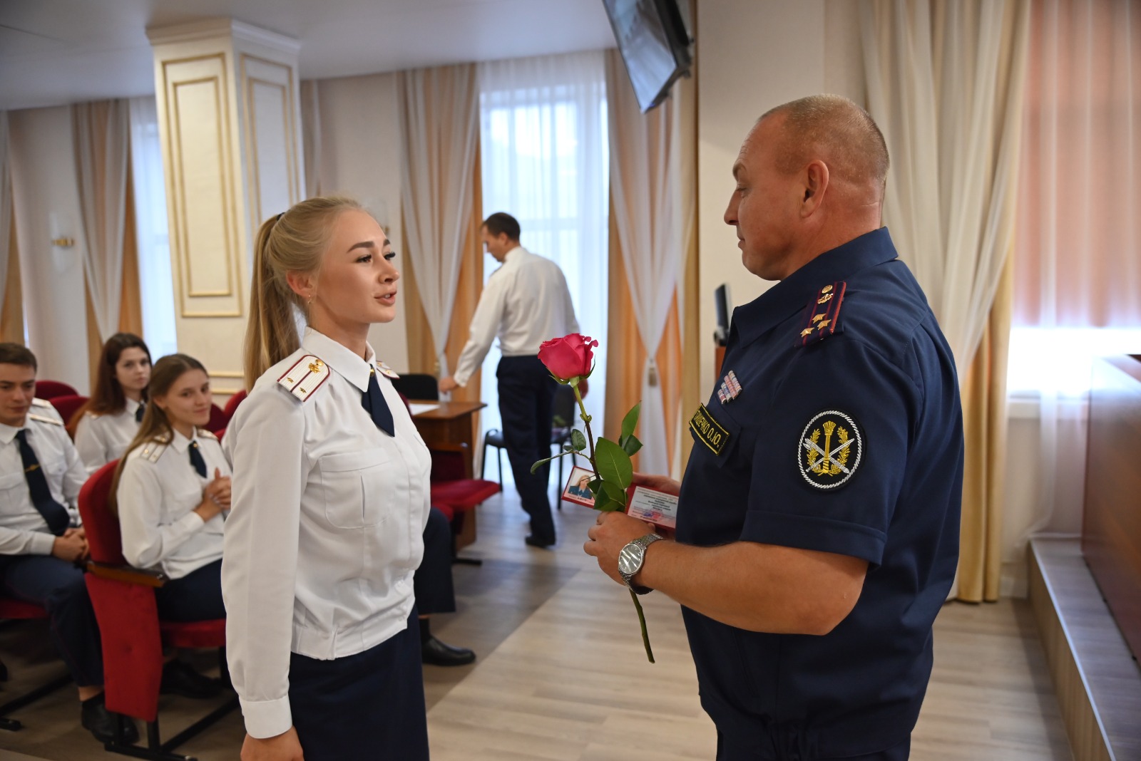 29 выпускников ведомственных образовательных учреждений получили из рук Сергея Куренкова и Олега Тишечко служебные удостоверения, с которыми они начнут трудовую деятельность в учреждениях уголовно-исполнительной системы региона.
