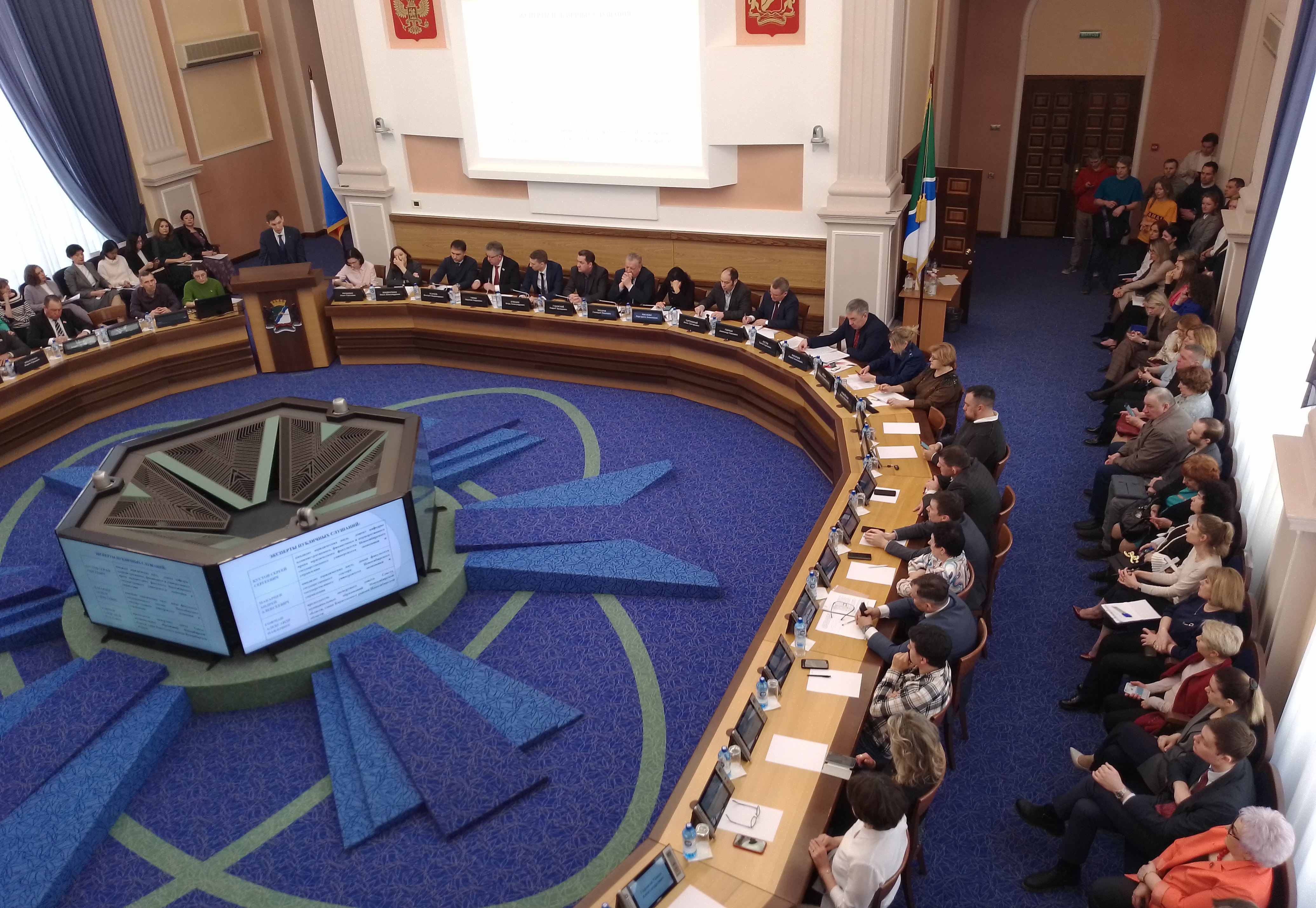 Стоит отметить, что для части желающих принять участие в общественных слушаниях мест в зале не хватило. Для них выставили ряды стульев в холле, куда была выведена трансляция слушаний.