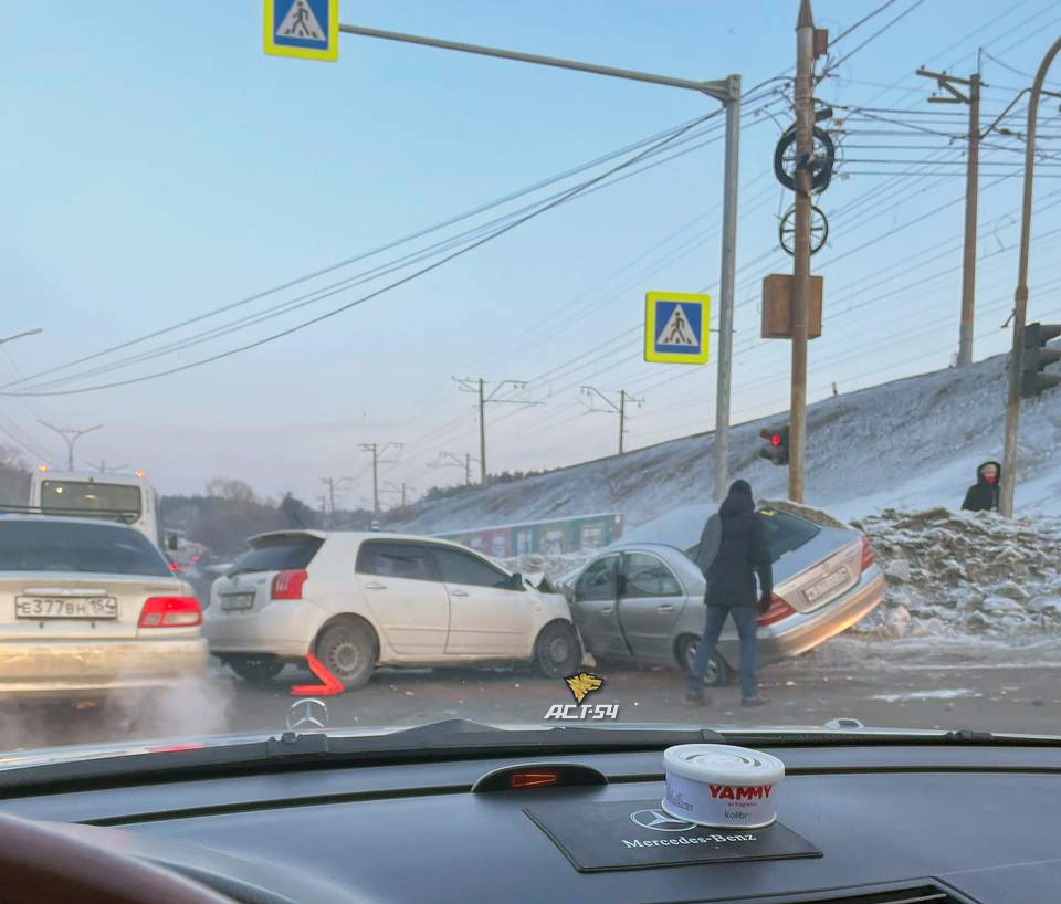 Информация о тройном ДТП появилась в паблике «АСТ-54» соцсети «ВКонтакте» около часа назад. Среди участников столкновения – седан Mercedes-Benz и хэтчбек Toyota, их видно на фотографиях, предоставленных очевидцами. У третьего автомобиля полностью разбита передняя часть, его марку сложно распознать.