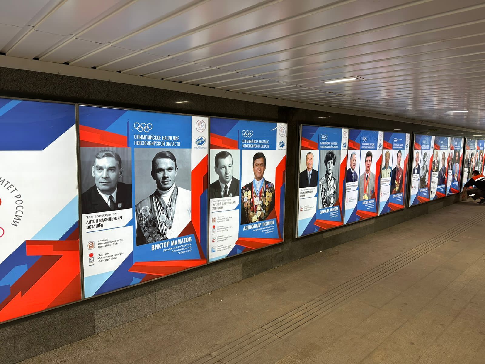 Имена и портреты спортсменов размещены в подземной части пешеходного перехода через дамбу Октябрьского моста в районе строящейся новой станции метро «Спортивная».