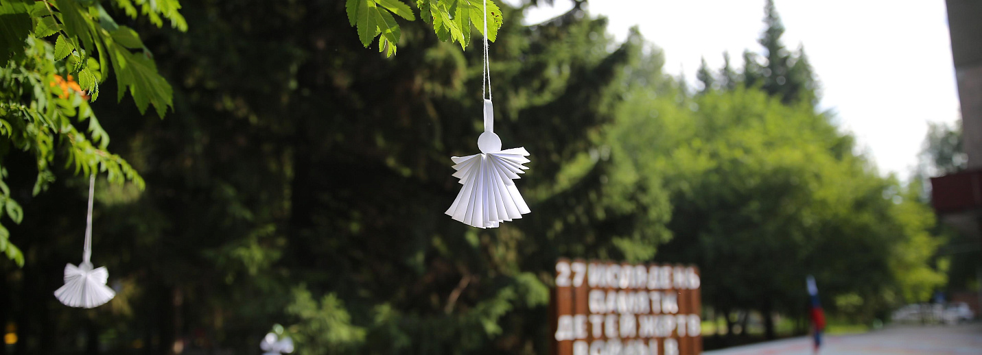 Десятки символических фигурок, сделанных детскими руками, развешали на деревьях у центра социальной помощи семье и детям «Заря», а в небо взмыли белые голуби.