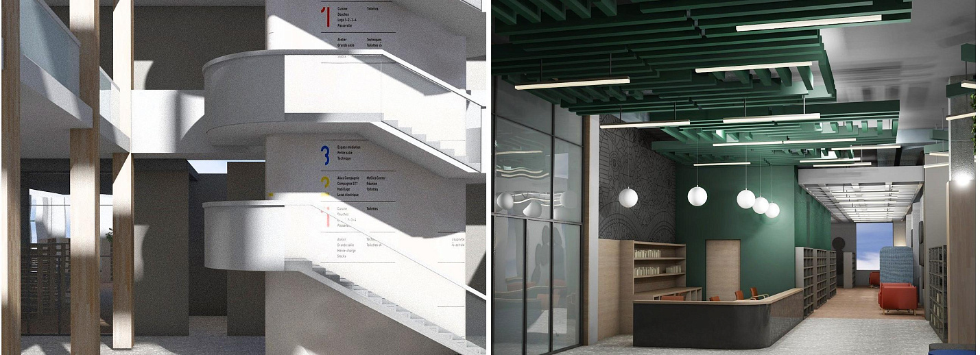 Предусмотрены информационная станция, ресепшен с большим экраном, показывающим расписание работы пространства. Студенты смогут выбирать свободные слоты для мероприятий в онлайн-режиме. Также медиаэкран, с учётом погоды и настроения ребят, с помощью нейросетей будет генерировать успокаивающий визуальный контент.