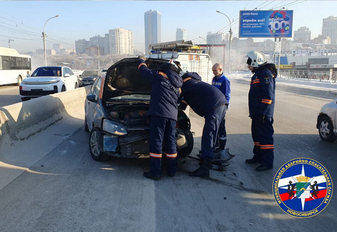 Водитель въехал в отбойник между полосами движения. Сегодня, 20 февраля, утром произошло ДТП на Димитровском мосту в Новосибирске.