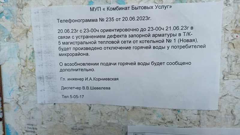 – О возобновлении подачи горячей воды будет сообщено дополнительно, – сказано в телефонограмме управляющим компаниям от Комбината бытовых услуг.
