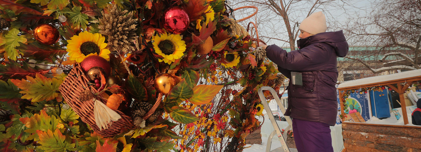 В этом году скульптуры оформили в соответствии с временами года: тут есть и весенние бабочки, и осенние корзины. Откроют одну из главных праздничных площадок 30 декабря.