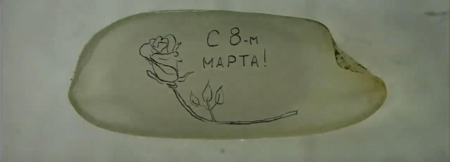 На опубликованных кадрах видно, что мастер сначала процарапал рисунок инструментом, затем нанёс на поверхность краску, стёр лишнюю — и в контуре углубления проявилось изображение розы с праздничной надписью.
