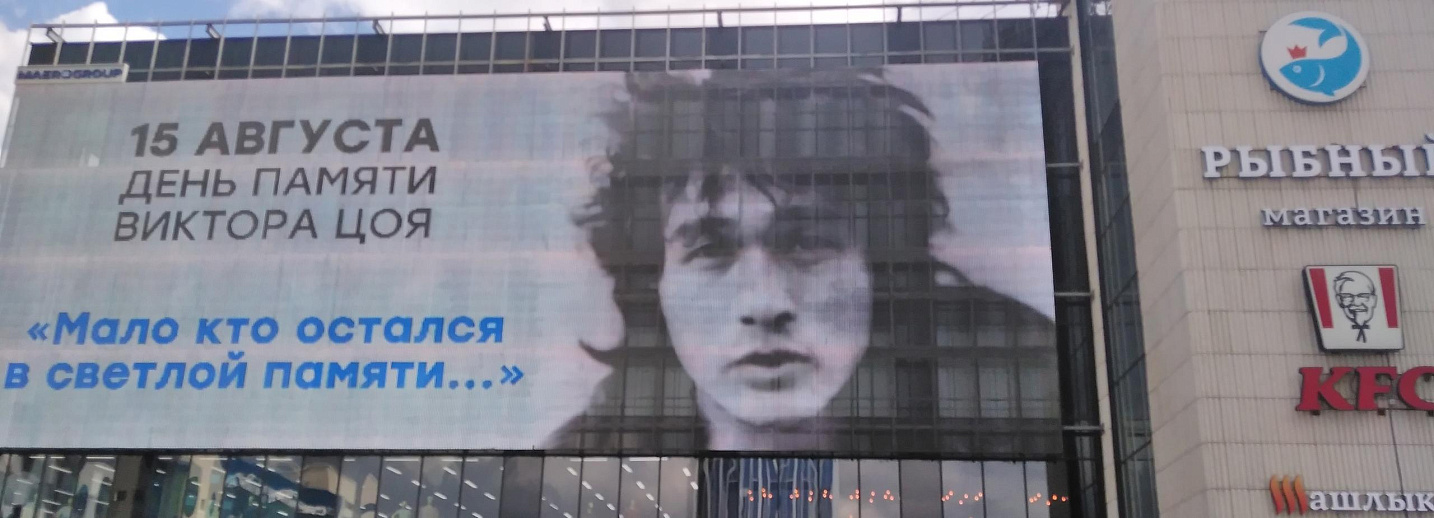 Во вторник, 15 августа, в Новосибирске на медиафасаде ГУМа время от времени появляется портрет рок-звезды Виктора Цоя.
