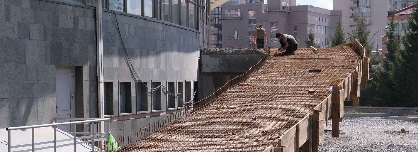 Наталия ЛавриченкоРемонт в театре «Глобус» идёт полным ходом. Внутри обновляют служебные помещения, а также фойе и сцену. Снаружи приступили к реконструкции эстакад с западной и восточной стороны здания. Рабочие провели армирование и установили опалубку, подготовили основание для укладки гранитной плитки. Сейчас идёт финишная отделка колонн эстакады.