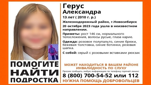 В Железнодорожном районе Новосибирска благополучно завершились поиски 13-летей Александры Герус,
