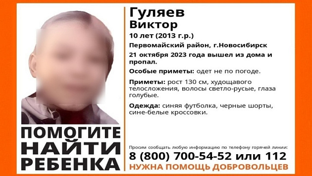 В Первомайском районе Новосибирска благополучно завершились поиски десятилетнего Виктора Гуляева, который 21 октября 2023 года вышел из дома и пропал. Мальчика искали волонтеры поисково-спасательного отряда (ПСО) «ЛизаАлерт». Вечером того же дня стало известно, что его нашли. Школьник жив, его здоровью ничего не угрожает.