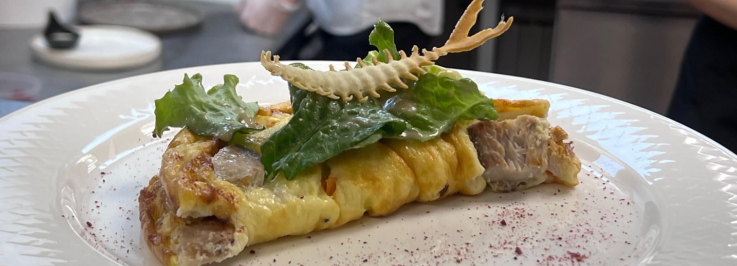 «Из злаков у нас гурьевская каша. Из молочных продуктов это бриошь, потому что, хоть это и хлеб, он на 60% состоит из сливочных продуктов. Из яйца мы представляем омлет с енисейским муксуном. Муксун — это северная рыба, сибирская, является нашим локальным продуктом», — рассказал бренд-шеф парка-отеля «Сосновый бор» Андрей Коробкин.