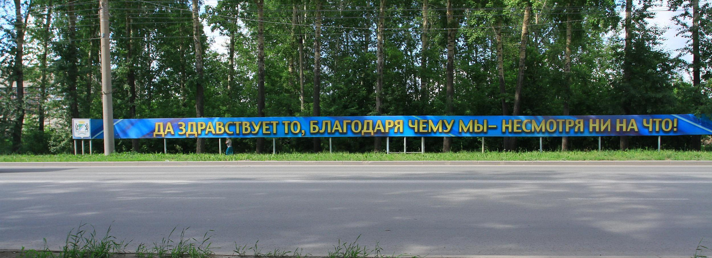Новосибирские новостиУже 32 года транспарант с необычной фразой заряжает оптимизмом всех, проезжающих по улице Петухова. Он настолько полюбился горожанам, что они предложили взять под охрану этот то ли лозунг, то ли тост.