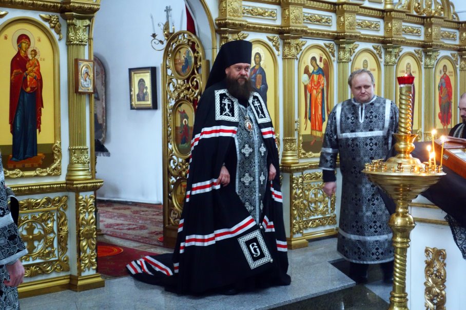 После пения великого прокимна и закрытия Царских врат епископ Филипп и священнослужители переоблачились в великопостные черные ризы.