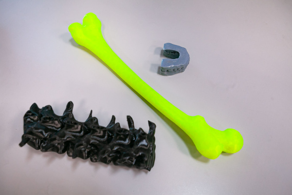 Перед изготовлением плечевого сустава выпускник выполнил несколько тестовых образцов анатомических моделей. По результатам КТ реальных пациентов политеховец разработал бедренную кость, челюсть и нижнюю часть позвоночника.