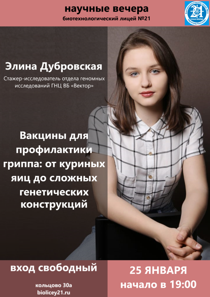 Из лекции стажера-исследователя отдела геномных исследований ГНЦ ВБ «Вектор» Элины Дубровской слушатели лекции «Вакцины для профилактики гриппа: от куриных яиц до сложных генетических конструкций» узнают, как вакцины разрабатываются в настоящее время. Она затронет тему ограничений, связанных с разработками вакцин.