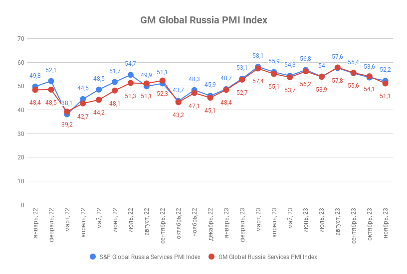 Ноябрьское значение индекса деловой активности ГлобалМедиа PMI (GM Global Services Russia PMI Index) составило 51,1 п.п. против 54,1 п.п. в октябре. Значение индекса деловой активности в сфере услуг от S&P Global (Global Russia Services PMI by the S&P Global) за аналогичный период снизилось с 53,6 п.п. до 52,2 п.п.