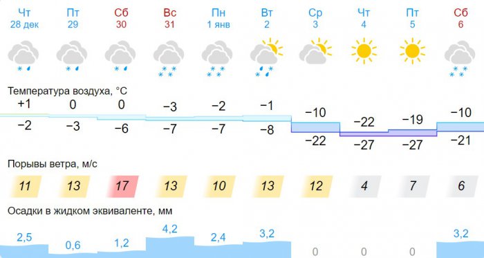 «В этом года мы предполагаем, что в новогоднюю ночь в Новосибирске температура составит от -4 до -6 градусов. Сильный ветер, который будет 29-30 декабря , в новогоднюю ночь утихнет, но будет снег. Достаточно комфортная погода для того, чтобы встретить Новый год не только за столом, но и на улице у елки», — сообщила Лапчик на пресс-конференции ТАСС 28 декабря.