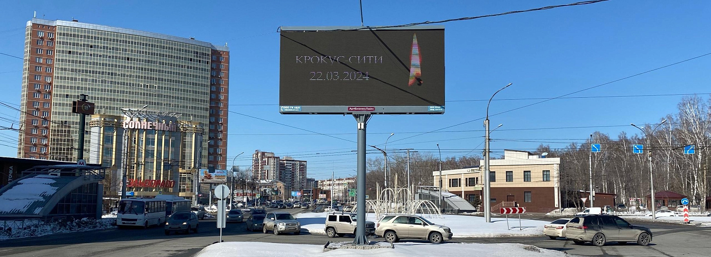 Новосибирские новостиФедеральный оператор убрал коммерческую рекламу с уличных видеоэкранов по всему городу. Её заменили изображениями в память о погибших во время теракта в Подмосковье. На чёрном фоне отображены дата трагедии (22.03.2024) и обозначено место происшествия.